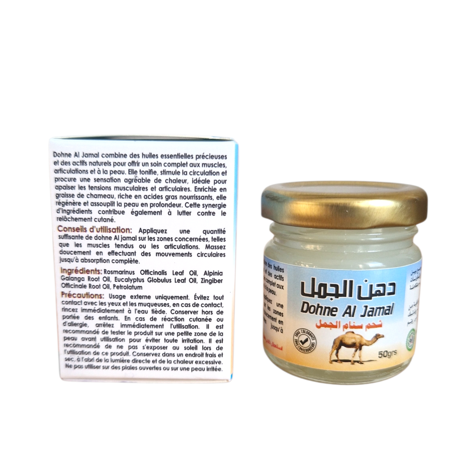 connue aussi sous le nom Dohne Al Jamal, un soin naturel et hautement nourrissant, formulé à base de graisse de chamelle et d’ingrédients végétaux choisis pour leurs vertus réparatrices. Elle est spécialement conçue pour les peaux sèches, fatiguées ou stressées. Sa texture onctueuse pénètre facilement pour apporter confort, souplesse et une hydratation profonde tout en enveloppant la peau d’une sensation de douceur et d’apaisement.