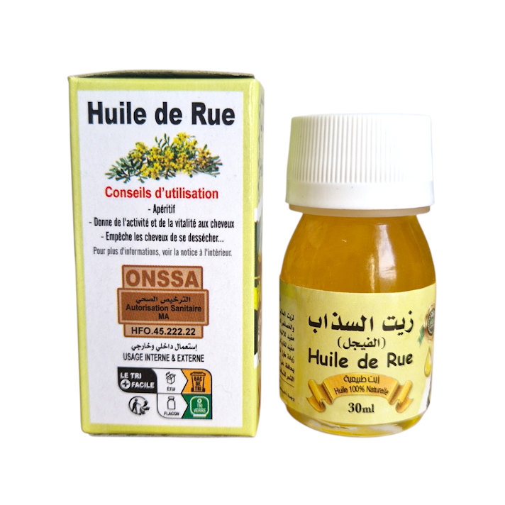 extraite de la plante Ruta graveolens. Connue pour ses vertus apaisantes, purifiantes et protectrices. Cette huile traditionnelle marocaine est utilisée pour calmer les tensions, favoriser la relaxation et soutenir le bien-être général. Idéale en usage externe dilué, elle aide à détendre le corps tout en offrant un parfum herbacé caractéristique.