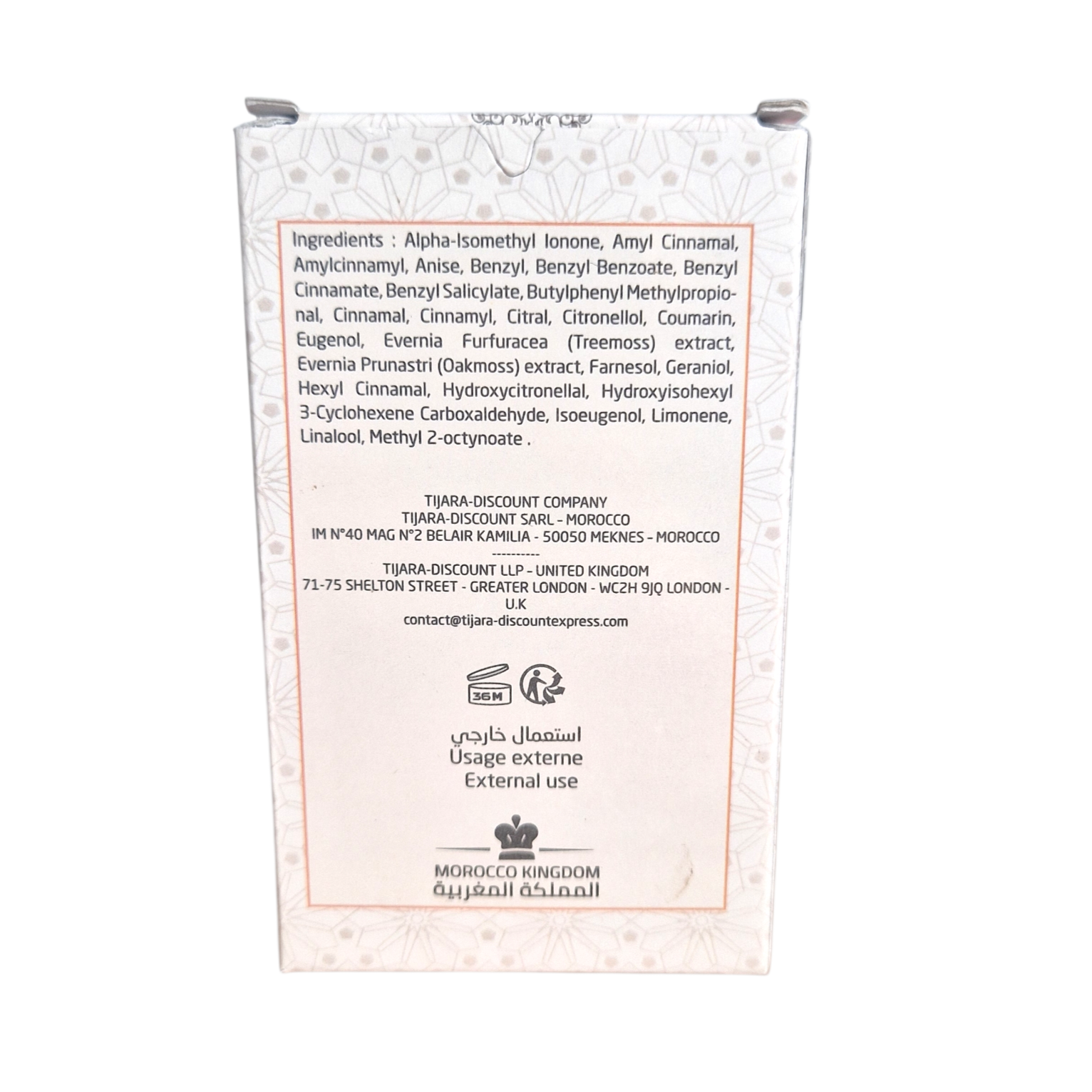 Ingrédient :  Alpha-isomethyl ionone, amyl cinnamal, amylcinnamyl, anise, benzyl, benzyl benzoate, benzyl cinnamate, benzyl salicylate, butylpenyl methylpropional, cinnamal, cinnamyl, citral, citronellol, coumarin, eugenol, evernia furfuracea (treemoss) extract, evernia prunastri (oakmoss) extract, farnesol geraniol, hexyl cinnamal, hydroxycitronellal, hydroxyisohexyl 3-cyclohexene carboxaldehyde, isoeugenol, limonene, linalool, methyl 2-octynoate. Sans alcool.